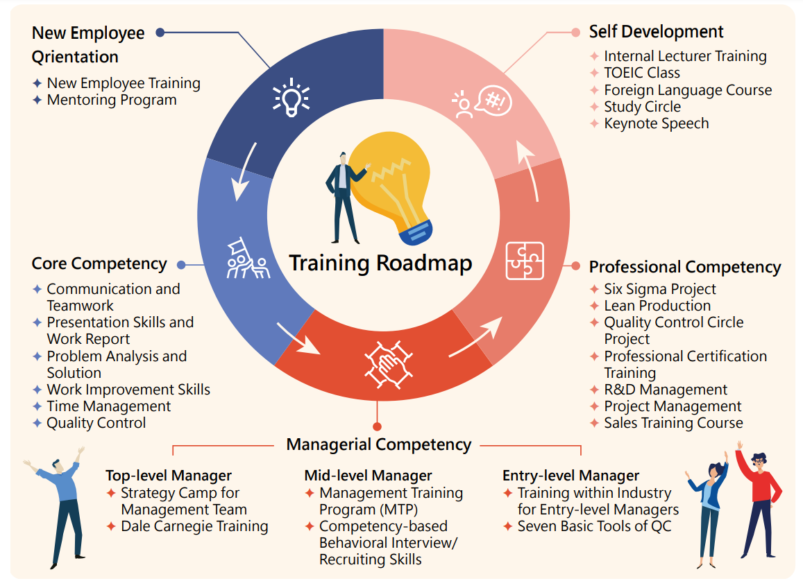 Taiflex recognizes the uniqueness of each employee and therefore provides diverse learning channels and development resources to strengthen competence needed by individuals, allowing employees to fully realize their personal value. The human resources unit also assists employees with mapping out their “Individual Development Plans” (IDP) based on job requirements, performance assessment outcomes and career developments. The plan is divided into three sections: On-Job Training, Off-Job Training and Self Development, with corresponding training blueprints. On-Job Training is the core of training, as this section has a direct and definite impact on whether the Company can function normally and effectively.