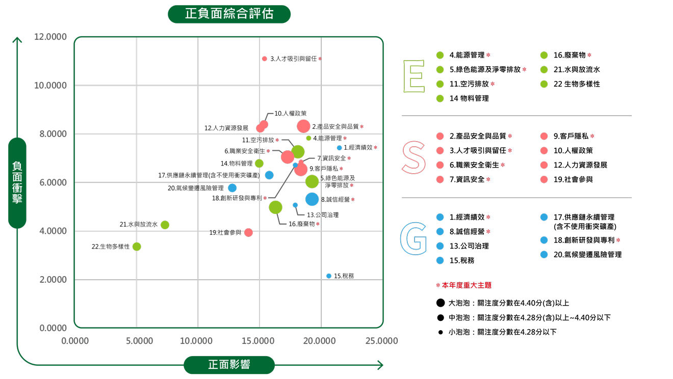上述議題範圍由本公司企業社會責任委員會和內部部門代表共同召開會議進行討論,綜合平時溝通管道中之關注議題决定對公司營運的衝擊程度。最後再依高關切且高衝擊歸納其重大考量面,成爲首要溝通的實質性議題。